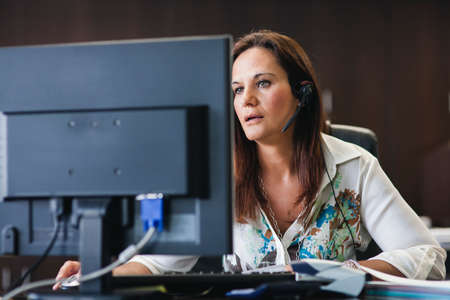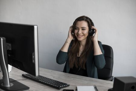 Young Brunette woman service operator calls in office. Young customer support manager consulting consumer by headset answering questions. Smiling business woman customer support agent.