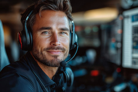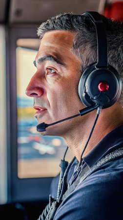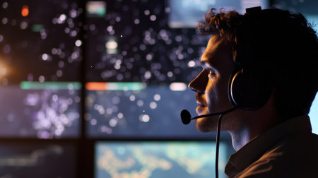 Air traffic controller wearing headset communicating with pilots from airport control tower