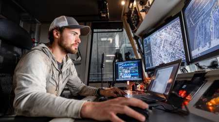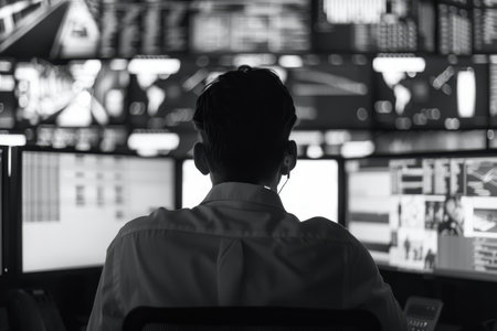 A man sitting in front of various computer monitors, monitoring security operations center activities, A security operations center analyst monitoring for security incidents