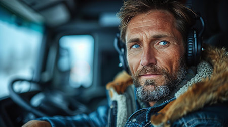Logistic center cargo trucks transportation shipping lorry delivery freight road. Portrait man driver driving truck car ready travel. Carrier warehouse storage vehicle load shipment delivery transport