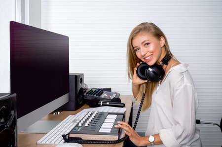 Sound engineer checks the correctness of the audio recorder before starting work. Atmosphere Producing music in a professional recording studio.