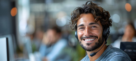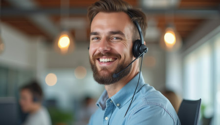 A smiling man with a beard wears a headset, exuding positivity in a bright, contemporary office environment. His friendly demeanor and professional attire create an inviting atmosphere, perfect for customer service or teamwork.