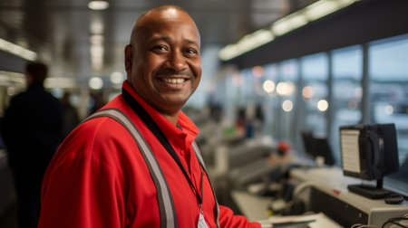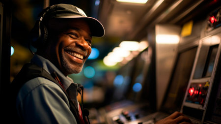 Portrait of a cheerful African American truck driver smiling warmly while seated in his vehicle, wearing a cap and work attire.