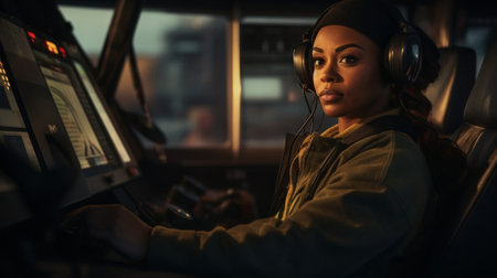 Close-up portrait of detail-oriented female bus operator framed by bus dashboard warm golden lighting