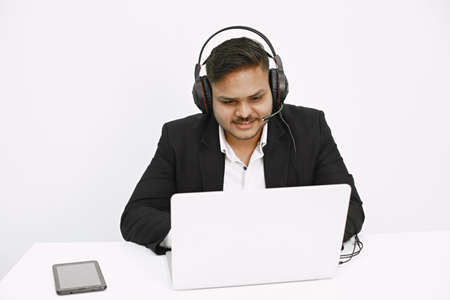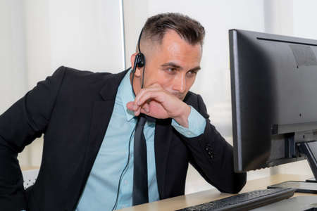 Businessman with headset as a customer service representative writes on PC keyboard in the office
