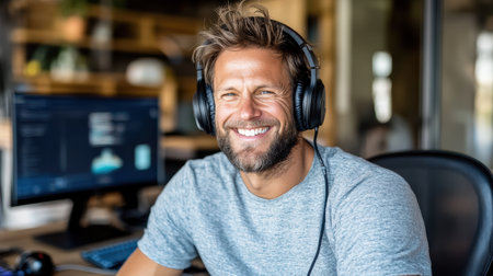 A Smiling man wearing headphones in modern workspace, enjoying podcast session