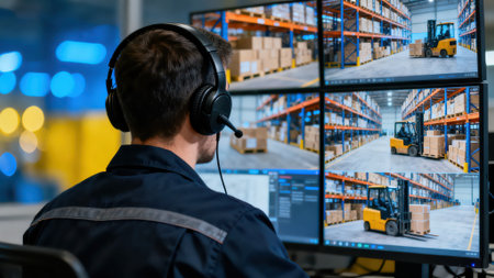 Warehouse worker using headset to support remote customer or colleague. This is a freight transportation and distribution warehouse. Industrial and industrial workers concept