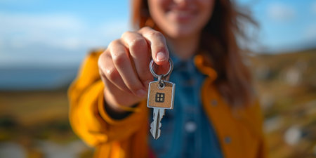 Woman holding a house key with a keychain outdoors on sunny day.