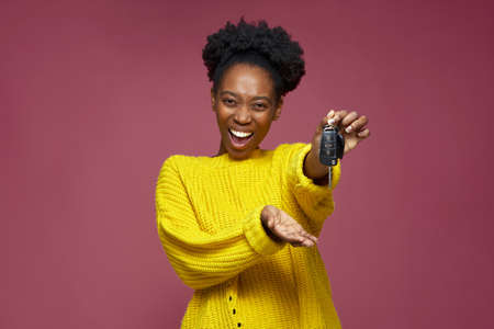 Excited joyful lucky young african american girl winner showing car keys. Successful happy female holding automobile key