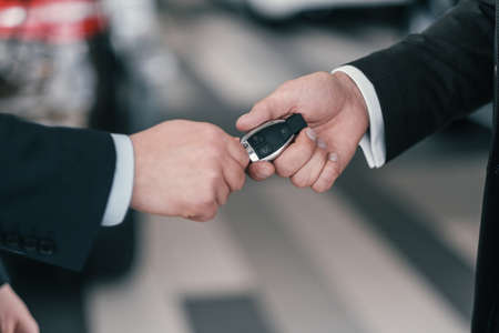 Hand of male buyer going to take remote control alarm system of new car