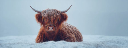 A close-up shot presents a Highland cow against a blurred winter background. The cow is distinguished by its long, brown fur and impressive horns. The scene showcases a natural, outdoor environment possibly suitable for various commercial or editorial applications such as articles or advertising campaigns.