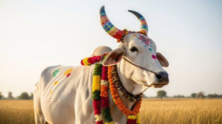 Decorated white bull with festive paint & garlands in wheat field
