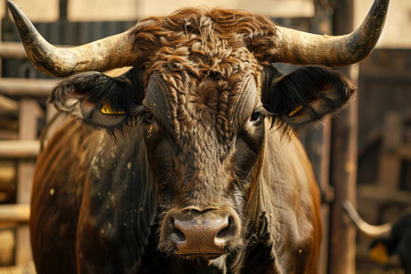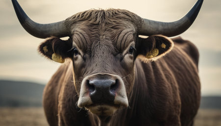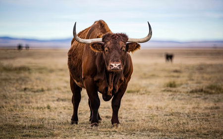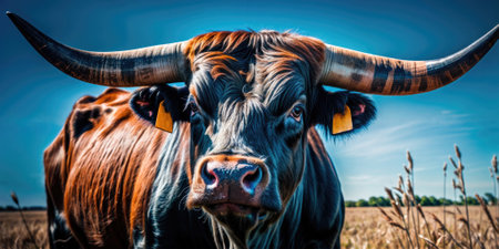 A close up of a brown bull with large horns, high quality, high resolution