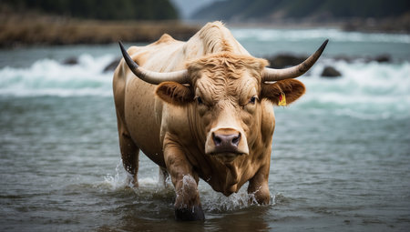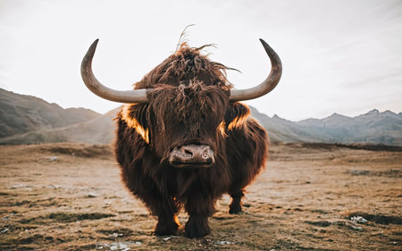 A majestic Highland cow stands proudly in a rugged Scottish landscape, its shaggy coat illuminated by the warm, golden glow of a setting sun. This iconic symbol of Scotlands natural heritage gazes calmly, embodying the wild and untamed spirit of the highlands.
