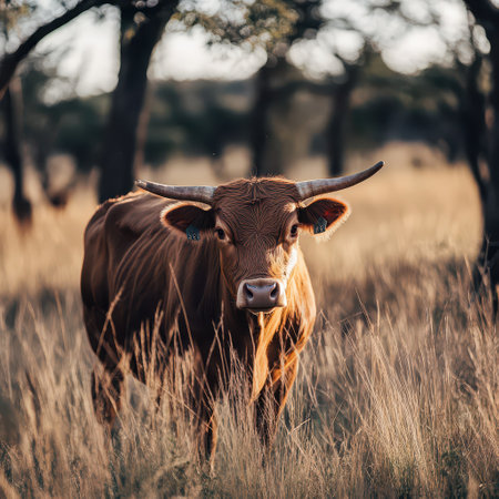 A brown cow with long horns stands in tall grass basking in the warm evening sunlight surrounded by trees in a serene landscape.