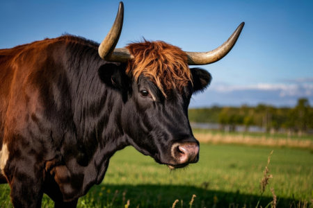 Close up of a longhorn cattle on the grassland