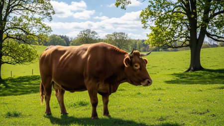 Portrait of a brown cow with horns on a green meadow