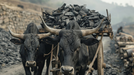 The charcoal is then loaded onto a cart pulled by a pair of sy oxen ready to be transported to nearby markets