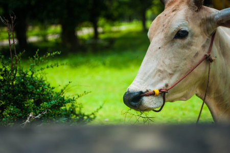 cow eating grass in the meadow. selective focus. nature.