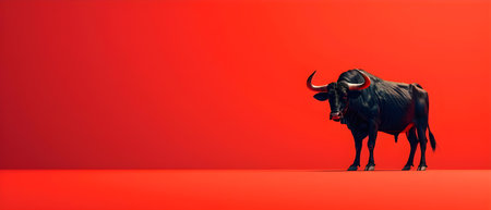 Powerful black bull stands against a textured gray backdrop, highlighting its muscular build and impressive horns, symbolizing strength and vitality in the wild