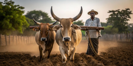 Farmer guiding oxen with large horns through dirt field at sunrise earthy textures and agricultural scene
