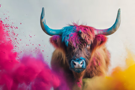 Close-up portrait of a bull with colored smoke on a white background