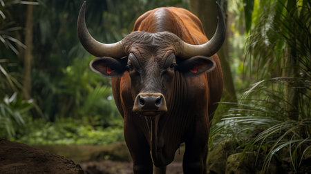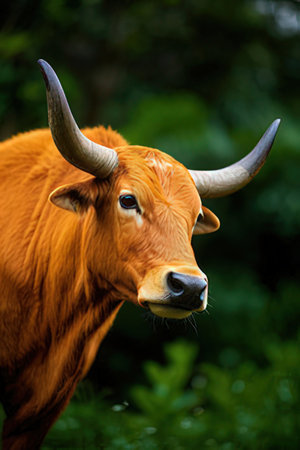 a large brown bull stands majestically near a cluster of trees, evoking a sense of mystery and the untamed beauty of the jungle. the artist, mike campau, skillfully employs exaggerated facial features and bold colorism to capture the essence of the moment. this captivating artwork raises ethical concerns while paying homage to traditional vietnamese influences. ai generated