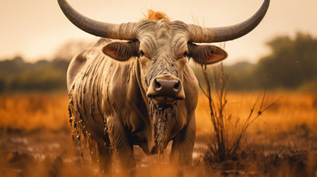 bull head in the field with grass in the background, showcasing african influence. this captivating photo by alessio albi captures explosive wildlife, reminiscent of seth macfarlane's style. a national geographic masterpiece, it exudes a blend of beige and amber tones, evoking post-apocalyptic themes. ai generated