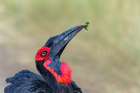 Southern Ground Hornbill (Bucorvus leadbeateri; formerly known as Bucorvus cafer) eating a prey in Kruger National Park in South Africa
