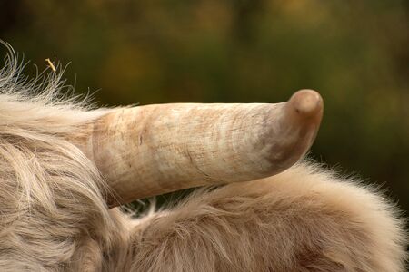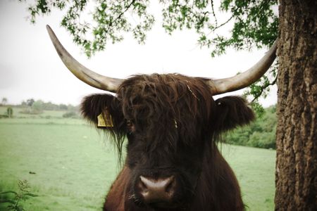 Beautiful long horns on a hairy coo in the Highlands of Scotland.