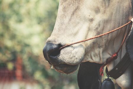 Close up of cow nose with rope on cow face isolated on nature background. Indian Cow with rope through nose..