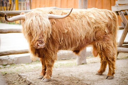 Closeup portrait of a Scottish highland bull seen from the front