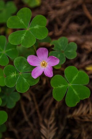 Clover (Genus Trifolium) with heart-shaped leaves as a symbol of luck and small pink flowers