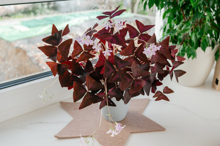 Beautiful flower of oxalis on background of purple triangular leaves with copy space. Blooming shamrock close up. Exotic houseplant.