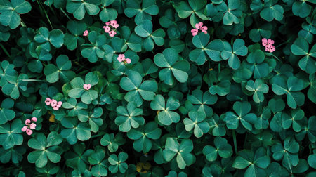 This vibrant image showcases a close-up view of lush green shamrock leaves interspersed with delicate pink flowers, embodying the essence of spring and nature's beauty.