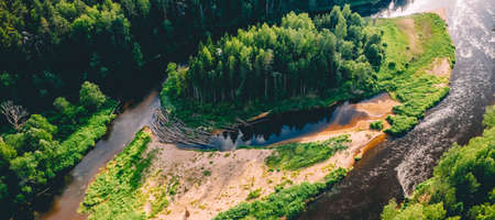 Scenic drone view of the green forest and the river. Beautiful summer landscape. Wild nature.