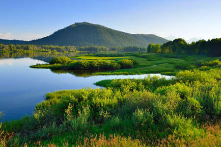 River surrounded by Trees and Mountains in American Landscape. Snake River, Oxbow Bend. Spring Season. Grand Teton National Park. Wyoming, United States. Nature Background.