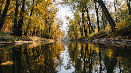 River flows gently through a forest filled with golden leaves. Trees stand tall on both sides, creating a tranquil scene during autumn.
