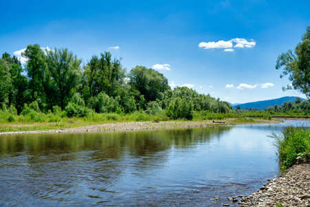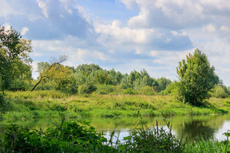 River landscape on a background of blue sky with clouds at sunny summer day