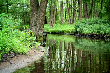 Panoramic view of the river in the spring forest. Nature background