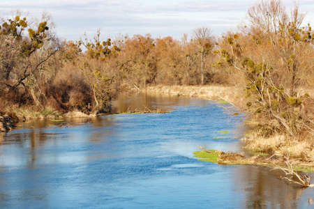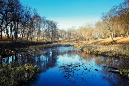 Shore of a small river in the autumn day. Autumn landscape