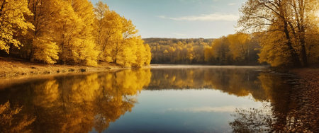 Vibrant yellow leaves create a stunning autumn display around a calm lake, with reflections mirroring the foliage on the water's surface as the day comes to a close. Generative AI.