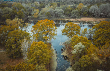 Wild River Winding in Autumn Foliage. Natural Patterns. Aerial Drone View.