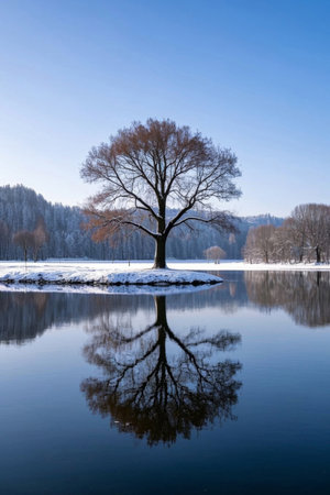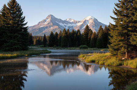 A serene landscape presents snow-covered mountain peaks mirrored in a still lake. Evergreen trees line the shore, contrasting with the bright blue sky. The composition showcases natural textures and light, potentially suitable for travel articles, environmental campaigns, and various commercial projects.