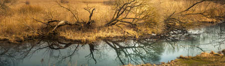 wide panoramic view of coastal bare trunks and tree branches with reflection in the calm water of a narrow river against the background of dry swamp reeds. early spring march landscape in daylight