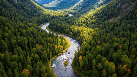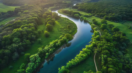 An aerial perspective captures a winding river snaking its way through a dense forest bathed in the warm, golden light of either sunrise or sunset. The sunlight filters through the lush green canopy, creating a dappled effect and illuminating the trees with a vibrant glow. The river's surface reflects the warm light and the surrounding foliage, adding to the serene and tranquil atmosphere of the scene. The vast expanse of the forest and the gentle curve of the river create a picturesque and...
