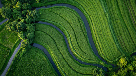 Aerial view of the green rice fields in the countryside of China