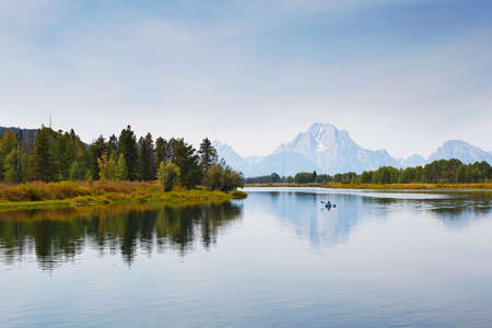 Paddling the calm waters of Oxbow Bend by kayak in Grand Teton National Park, Wyoming, USA