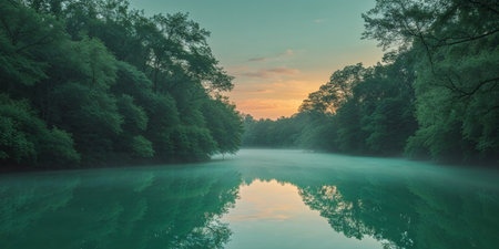 AI Generated. Serene Teal Lake Surrounded by Lush Green Trees at Dawn