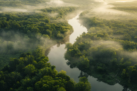 A serene aerial view of a foggy river winding through a dense forest at sunrise, creating a mystical atmosphere.